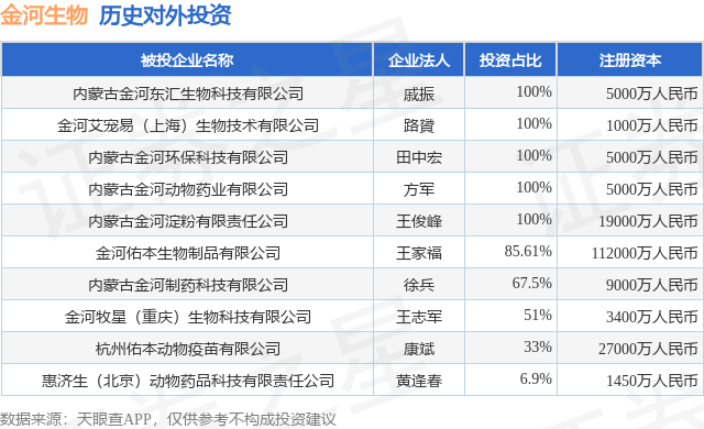 证券之星消息,根据天眼查APP显示,金河生物(002688.SZ)新增一起对外投资事件,被投资公司为内蒙古金河东汇生物科技有限公司,法定代表人戚振,投资占比为100%。该公司从事医药制造业,注册资本为5000万人民币。目前,金河生物共存在对外投资10项,详见下表: