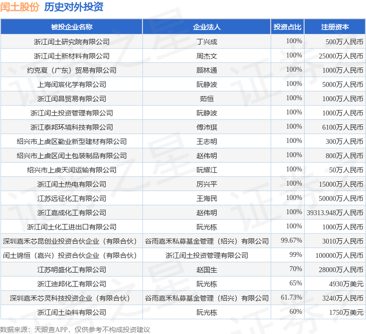通过天眼查大数据分析,浙江闰土股份有限公司共对外投资了41家企业,参与招投标项目39次;财产线索方面有商标信息78条,专利信息189条,著作权信息1条;此外企业还拥有行政许可36个。据2024年报数据,闰土股份长期股权投资7.95亿元,同比增16.87%。