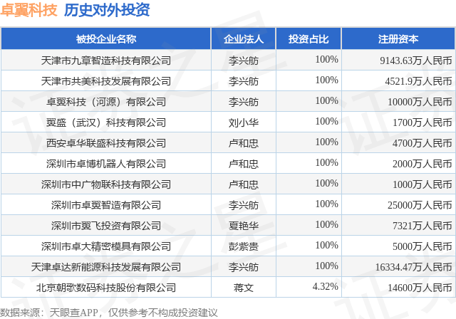 证券之星消息,根据天眼查APP显示,卓翼科技(002369.SZ)新增一起对外投资事件,被投资公司为天津市九章智造科技有限公司,法定代表人李兴舫,投资占比为100%。该公司从事计算机、通信和其他电子设备制造业,注册资本为9143.63万人民币。目前,卓翼科技共存在对外投资12项,详见下表: