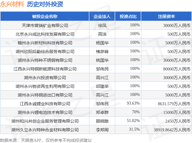 证券之星消息,根据天眼查APP显示,永兴材料(002756.SZ)新增一起对外投资事件,被投资公司为天津市普瑞矿业有限公司,法定代表人徐凤,投资占比为100%。该公司从事商务服务业,注册资本为30000万人民币。目前,永兴材料共存在对外投资13项,详见下表: