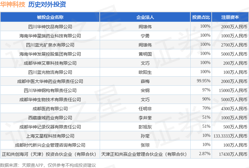 证券之星消息,根据天眼查APP显示,华神科技(000790.SZ)新增一起对外投资事件,被投资公司为上海艾星程科技有限公司,法定代表人孙毫,投资占比为10%。该公司从事软件和信息技术服务业,注册资本为133.3333万人民币。目前,华神科技共存在对外投资15项,详见下表:
