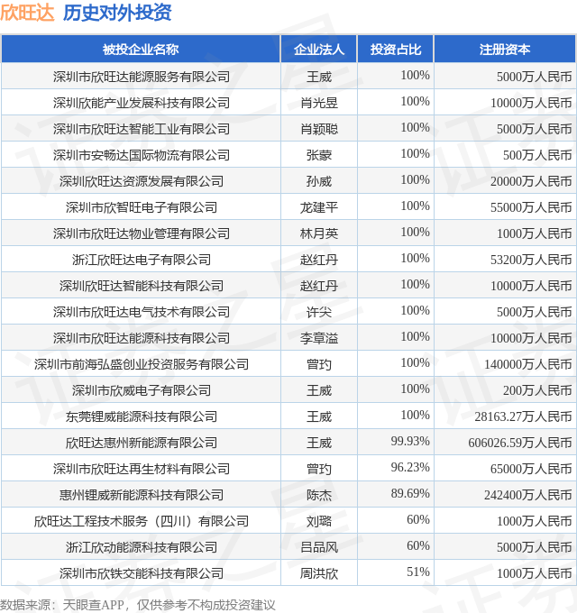 证券之星消息,根据天眼查APP显示,欣旺达(300207.SZ)新增一起对外投资事件,被投资公司为深圳市欣旺达能源服务有限公司,法定代表人王威,投资占比为100%。该公司从事商务服务业,注册资本为5000万人民币。目前,欣旺达共存在对外投资29项,投资占比前20的项目见下表: