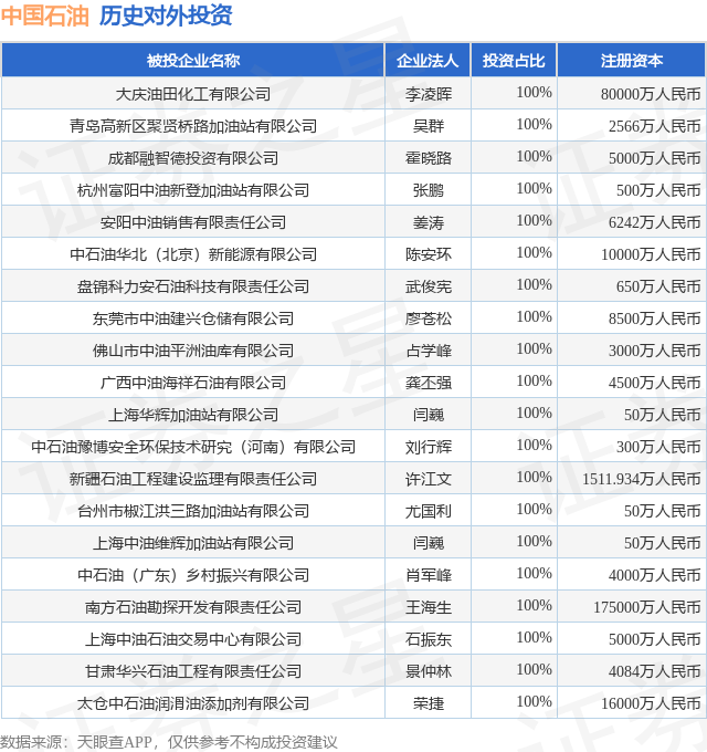 证券之星消息,根据天眼查APP显示,中国石油(601857.SH)新增一起对外投资事件,被投资公司为大庆油田化工有限公司,法定代表人李凌晖,投资占比为100%。该公司从事化学原料和化学制品制造业,注册资本为80000万人民币。目前,中国石油共存在对外投资1074项,投资占比前20的项目见下表: