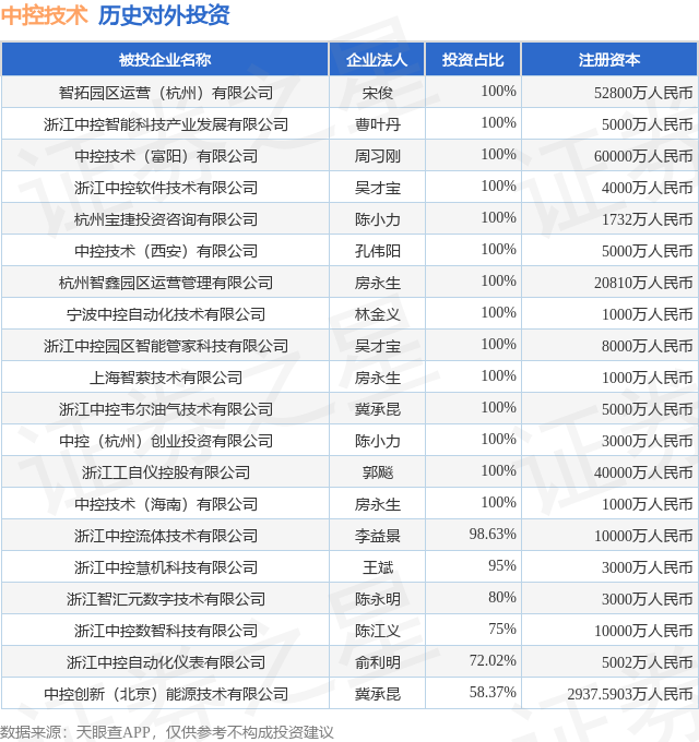 证券之星消息,根据天眼查APP显示,中控技术(688777.SH)新增一起对外投资事件,被投资公司为智拓园区运营(杭州)有限公司,法定代表人宋俊,投资占比为100%。该公司从事科技推广和应用服务业,注册资本为52800万人民币。目前,中控技术共存在对外投资41项,投资占比前20的项目见下表: