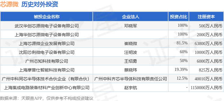 证券之星消息,根据天眼查APP显示,芯源微(688037.SH)新增一起对外投资事件,被投资公司为武汉华创芯源微电子设备有限公司,法定代表人邓晓军,投资占比为100%。该公司从事计算机、通信和其他电子设备制造业,注册资本为500万人民币。目前,芯源微共存在对外投资8项,详见下表: