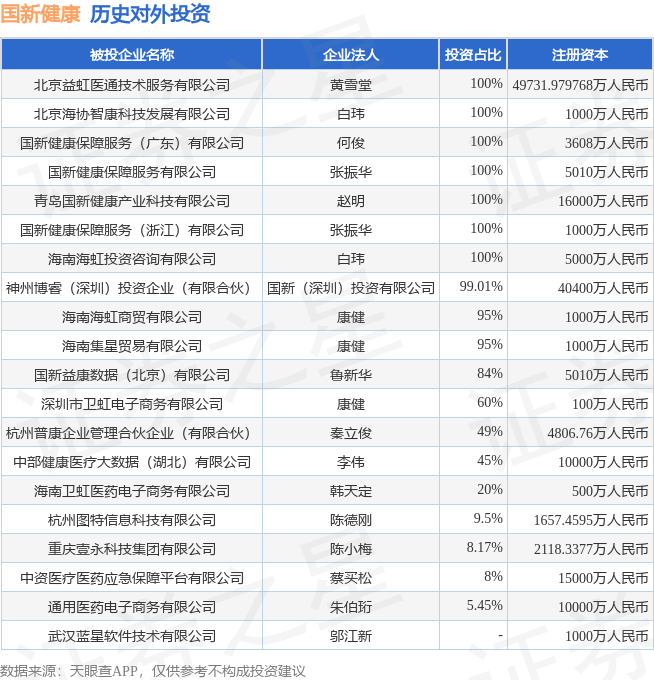 证券之星消息,根据天眼查APP显示,国新健康(000503.SZ)新增一起对外投资事件,被投资公司为北京益虹医通技术服务有限公司,法定代表人黄雪堂,投资占比为100%。该公司从事科技推广和应用服务业,注册资本为49731.979768万人民币。目前,国新健康共存在对外投资20项,详见下表: