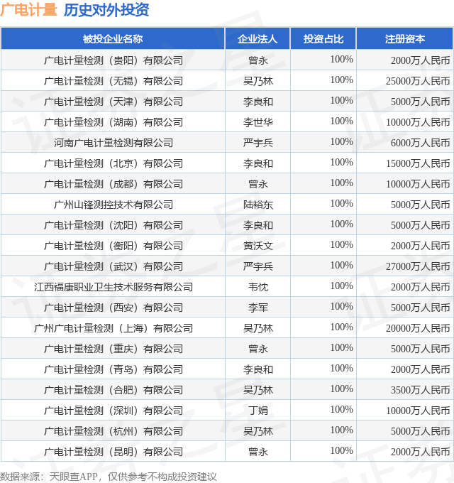 证券之星消息,根据天眼查APP显示,广电计量(002967.SZ)新增一起对外投资事件,被投资公司为广电计量检测(贵阳)有限公司,法定代表人曾永,投资占比为100%。该公司从事专业技术服务业,注册资本为2000万人民币。目前,广电计量共存在对外投资33项,投资占比前20的项目见下表: