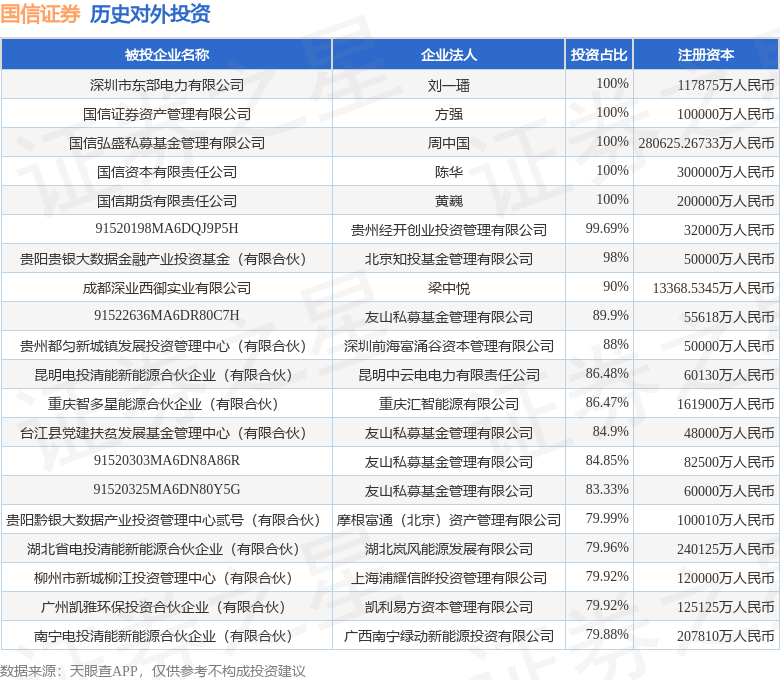 证券之星消息,根据天眼查APP显示,国信证券(002736.SZ)新增一起对外投资事件,被投资公司为安徽安泽电工股份有限公司,法定代表人朱家亮,投资占比为3.04%。该公司从事电气机械和器材制造业,注册资本为4810.7758万人民币。目前,国信证券共存在对外投资131项,投资占比前20的项目见下表: