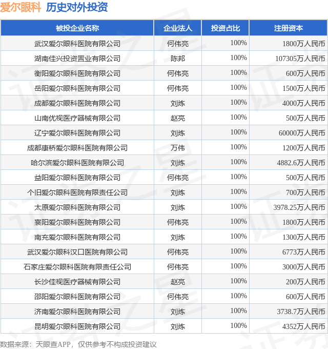 证券之星消息,根据天眼查APP显示,爱尔眼科(300015.SZ)新增一起对外投资事件,被投资公司为芜湖爱尔眼科医院有限公司,法定代表人何伟亮,投资占比为85%。该公司从事卫生,注册资本为3000万人民币。目前,爱尔眼科共存在对外投资376项,投资占比前20的项目见下表: