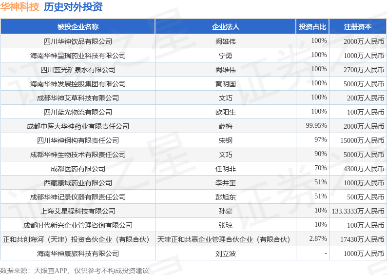 证券之星消息,根据天眼查APP显示,华神科技(000790.SZ)新增一起对外投资事件,被投资公司为海南华神康旅科技有限公司,法定代表人刘立波,投资占比为-。该公司从事科技推广和应用服务业,注册资本为1000万人民币。目前,华神科技共存在对外投资16项,详见下表: