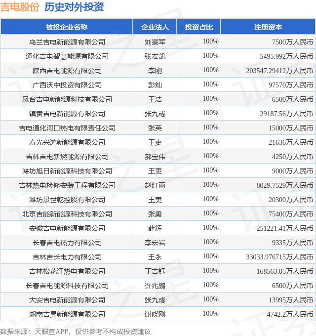 证券之星消息,根据天眼查APP显示,吉电股份(000875.SZ)新增一起对外投资事件,被投资公司为乌兰吉电新能源有限公司,法定代表人刘景军,投资占比为100%。该公司从事电力、热力生产和供应业,注册资本为7500万人民币。目前,吉电股份共存在对外投资92项,投资占比前20的项目见下表: