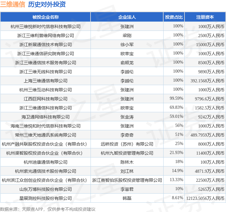 通过天眼查大数据分析,三维通信股份有限公司共对外投资了28家企业,参与招投标项目1577次;财产线索方面有商标信息43条,专利信息616条,著作权信息153条;此外企业还拥有行政许可58个。据2024年报数据,三维通信商誉9048.96万元,同比减72.64%。长期股权投资2556.92万元,同比增0.72%。
