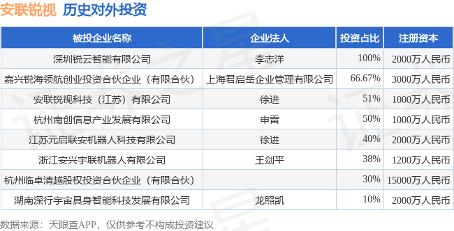 证券之星消息,根据天眼查APP显示,安联锐视(301042.SZ)新增一起对外投资事件,被投资公司为湖南深行宇宙具身智能科技发展有限公司,法定代表人龙照凯,投资占比为10%。该公司从事软件和信息技术服务业,注册资本为2000万人民币。目前,安联锐视共存在对外投资8项,详见下表: