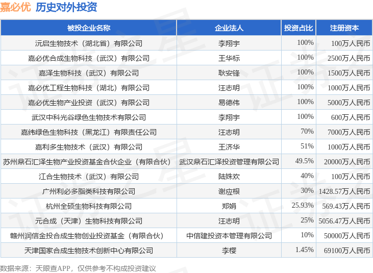 证券之星消息,根据天眼查APP显示,嘉必优(688089.SH)新增一起对外投资事件,被投资公司为沅启生物技术(湖北省)有限公司,法定代表人李翔宇,投资占比为100%。该公司从事科技推广和应用服务业,注册资本为100万人民币。目前,嘉必优共存在对外投资15项,详见下表: