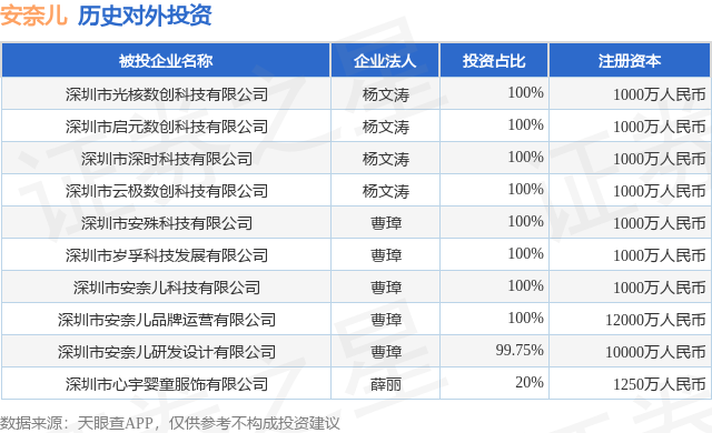证券之星消息,根据天眼查APP显示,安奈儿(002875.SZ)新增一起对外投资事件,被投资公司为深圳市光核数创科技有限公司,法定代表人杨文涛,投资占比为100%。该公司从事软件和信息技术服务业,注册资本为1000万人民币。目前,安奈儿共存在对外投资10项,详见下表: