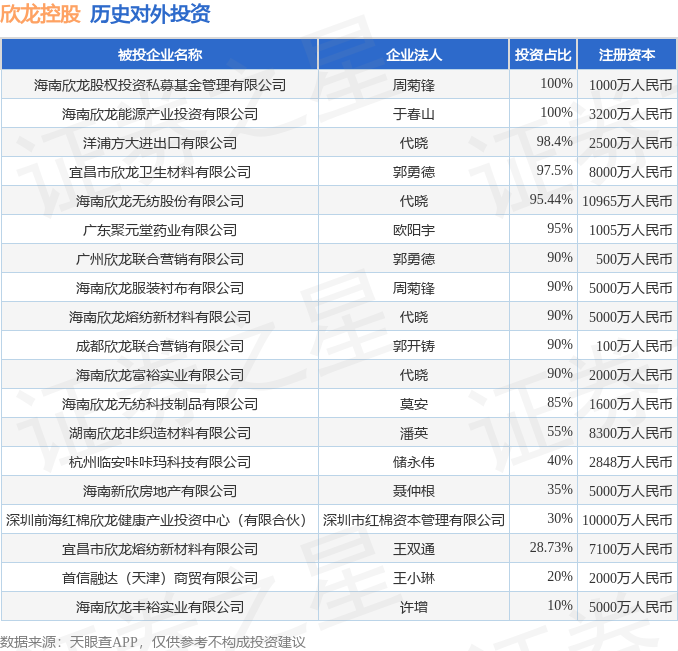 证券之星消息,根据天眼查APP显示,欣龙控股(000955.SZ)新增一起对外投资事件,被投资公司为宜昌市欣龙卫生材料有限公司,法定代表人郭勇德,投资占比为97.5%。该公司从事医药制造业,注册资本为8000万人民币。目前,欣龙控股共存在对外投资19项,详见下表: