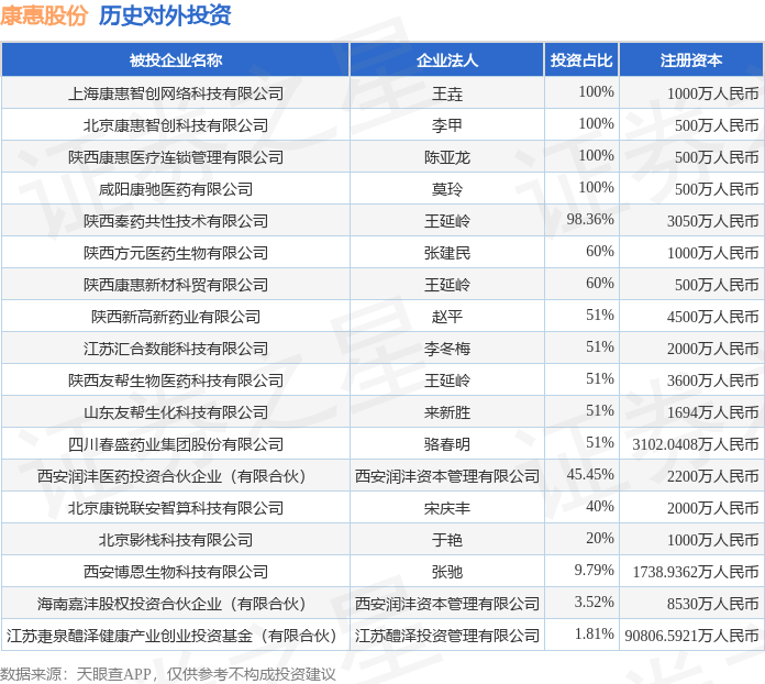 证券之星消息,根据天眼查APP显示,康惠股份(603139.SH)新增一起对外投资事件,被投资公司为北京康锐联安智算科技有限公司,法定代表人宋庆丰,投资占比为40%。该公司从事科技推广和应用服务业,注册资本为2000万人民币。目前,康惠股份共存在对外投资18项,详见下表: