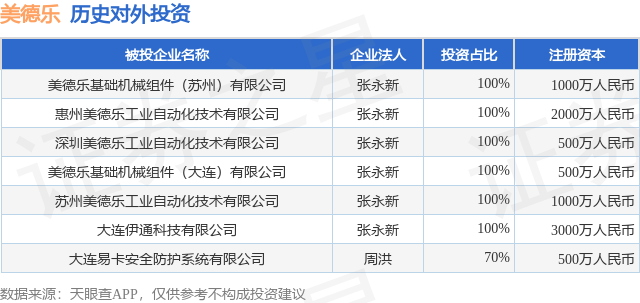证券之星消息,根据天眼查APP显示,美德乐(920119.BJ)新增一起对外投资事件,被投资公司为美德乐基础机械组件(苏州)有限公司,法定代表人张永新,投资占比为100%。该公司从事通用设备制造业,注册资本为1000万人民币。目前,美德乐共存在对外投资7项,详见下表: