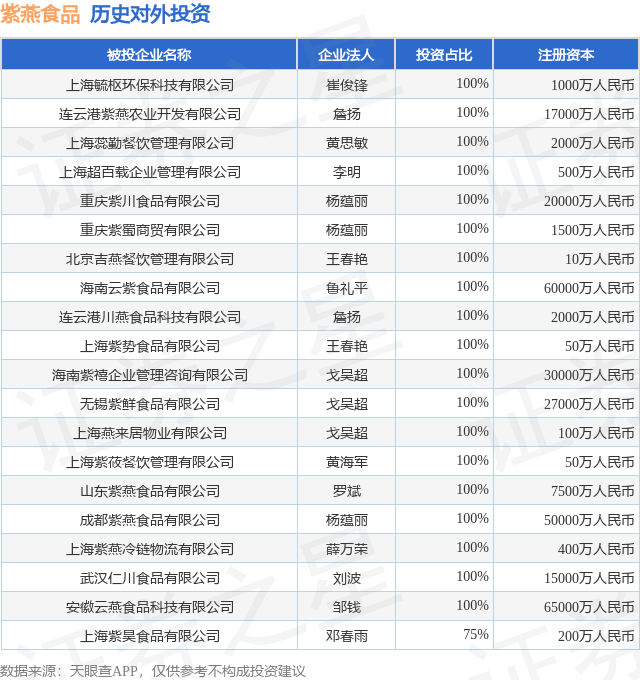 证券之星消息,根据天眼查APP显示,紫燕食品(603057.SH)新增一起对外投资事件,被投资公司为湖北紫琪食品有限公司,法定代表人周栩烨,投资占比为60%。该公司从事食品制造业,注册资本为3000万人民币。目前,紫燕食品共存在对外投资33项,投资占比前20的项目见下表:
