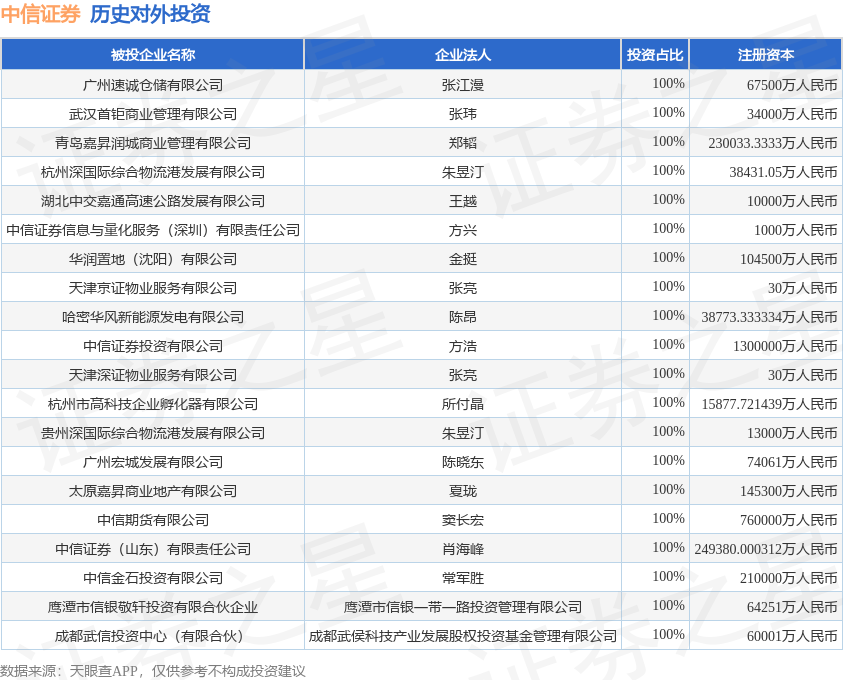 证券之星消息,根据天眼查APP显示,中信证券(600030.SH)新增一起对外投资事件,被投资公司为广州速诚仓储有限公司,法定代表人张江漫,投资占比为100%。该公司从事装卸搬运和仓储业,注册资本为67500万人民币。目前,中信证券共存在对外投资338项,投资占比前20的项目见下表: