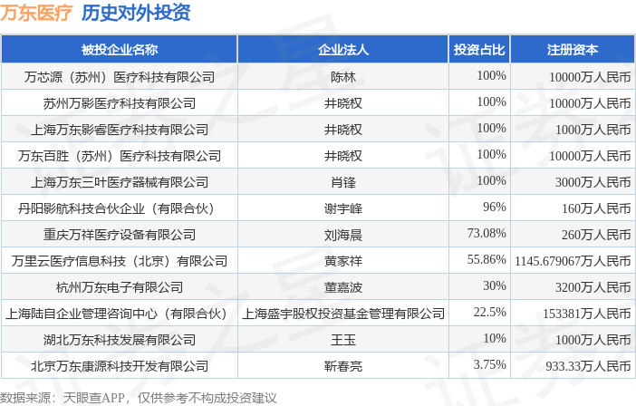 证券之星消息,根据天眼查APP显示,万东医疗(600055.SH)新增一起对外投资事件,被投资公司为万芯源(苏州)医疗科技有限公司,法定代表人陈林,投资占比为100%。该公司从事专用设备制造业,注册资本为10000万人民币。目前,万东医疗共存在对外投资12项,详见下表: