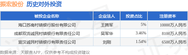 证券之星消息,根据天眼查APP显示,振宏股份(920200.BJ)新增一起对外投资事件,被投资公司为海口苏南村镇银行股份有限公司,法定代表人王腾军,投资占比为5%。该公司从事货币金融服务,注册资本为10000万人民币。目前,振宏股份共存在对外投资3项,详见下表: