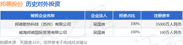 证券之星消息,根据天眼查APP显示,邦德股份(920271.BJ)新增一起对外投资事件,被投资公司为邦德散热科技(苏州)有限公司,法定代表人吴国良,投资占比为100%。该公司从事汽车制造业,注册资本为35000万人民币。目前,邦德股份共存在对外投资2项,详见下表:
