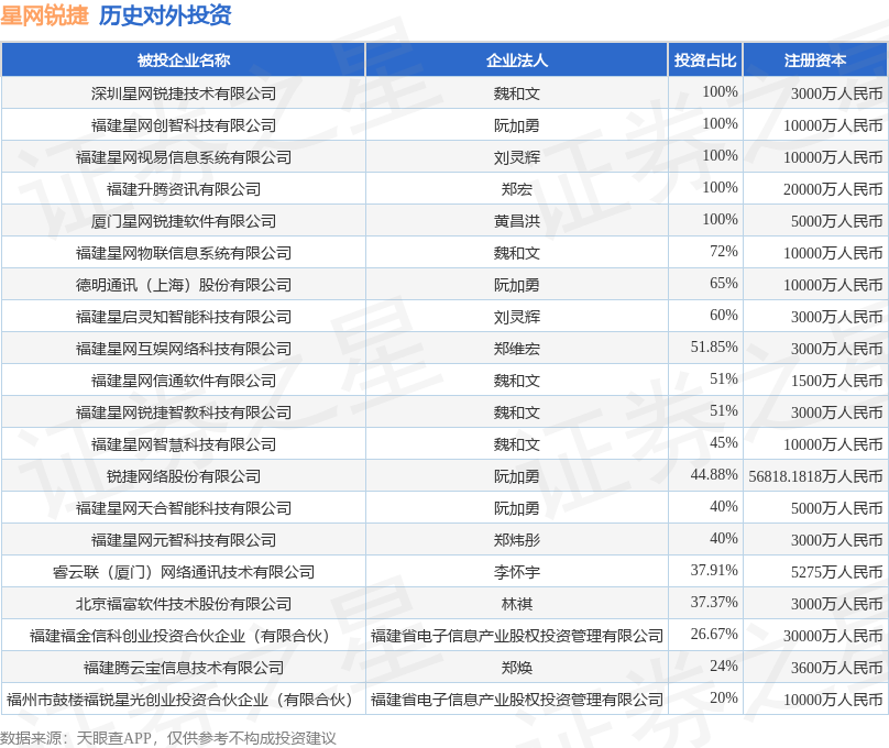 证券之星消息,根据天眼查APP显示,星网锐捷(002396.SZ)新增一起对外投资事件,被投资公司为福建星启灵知智能科技有限公司,法定代表人刘灵辉,投资占比为60%。该公司从事软件和信息技术服务业,注册资本为3000万人民币。目前,星网锐捷共存在对外投资23项,投资占比前20的项目见下表: