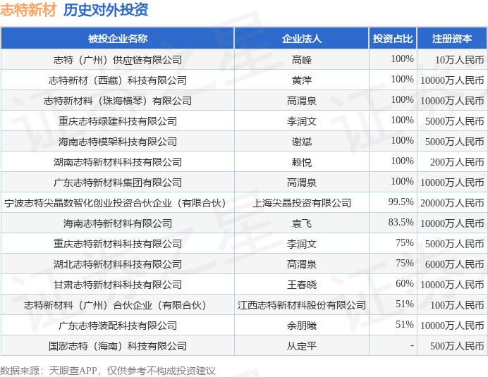 证券之星消息,根据天眼查APP显示,志特新材(300986.SZ)新增一起对外投资事件,被投资公司为志特(广州)供应链有限公司,法定代表人高峰,投资占比为100%。该公司从事科技推广和应用服务业,注册资本为10万人民币。目前,志特新材共存在对外投资15项,详见下表: