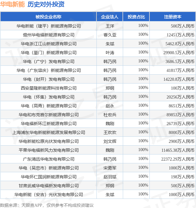 证券之星消息,根据天眼查APP显示,华电新能(600930.SH)新增一起对外投资事件,被投资公司为华电新能(建平)新能源有限公司,法定代表人王洋,投资占比为100%。该公司从事电力、热力生产和供应业,注册资本为500万人民币。目前,华电新能共存在对外投资578项,投资占比前20的项目见下表: