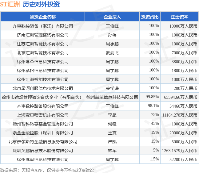 证券之星消息,根据天眼查APP显示,ST汇洲(002122.SZ)新增一起对外投资事件,被投资公司为齐重数控装备(浙江)有限公司,法定代表人王俊峰,投资占比为100%。该公司从事通用设备制造业,注册资本为10000万人民币。目前,ST汇洲共存在对外投资16项,详见下表: