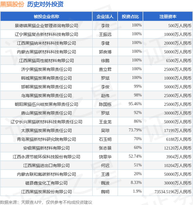 证券之星消息,根据天眼查APP显示,黑猫股份(002068.SZ)新增一起对外投资事件,被投资公司为辽宁长兴黑猫碳材料科技有限责任公司,法定代表人王金龙,投资占比为86%。该公司从事专业技术服务业,注册资本为50000万人民币。目前,黑猫股份共存在对外投资20项,详见下表: