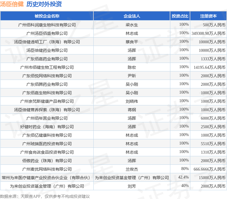 证券之星消息,根据天眼查APP显示,汤臣倍健(300146.SZ)新增一起对外投资事件,被投资公司为天津海棠同慧创业投资合伙企业(有限合伙),法定代表人,投资占比为-。该公司从事商务服务业,注册资本为41201万人民币。目前,汤臣倍健共存在对外投资37项,投资占比前20的项目见下表: