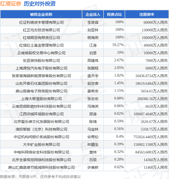 证券之星消息,根据天眼查APP显示,红塔证券(601236.SH)新增一起对外投资事件,被投资公司为张家港海锅新能源装备股份有限公司,法定代表人盛天宇,投资占比为1.82%。该公司从事金属制品业,注册资本为10436.0724万人民币。目前,红塔证券共存在对外投资20项,详见下表: