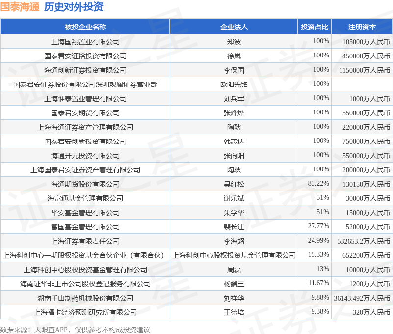 证券之星消息,根据天眼查APP显示,国泰海通(601211.SH)新增一起对外投资事件,被投资公司为厦门市铂联科技股份有限公司,法定代表人吴永进,投资占比为3.68%。该公司从事计算机、通信和其他电子设备制造业,注册资本为16024.3368万人民币。目前,国泰海通共存在对外投资211项,投资占比前20的项目见下表: