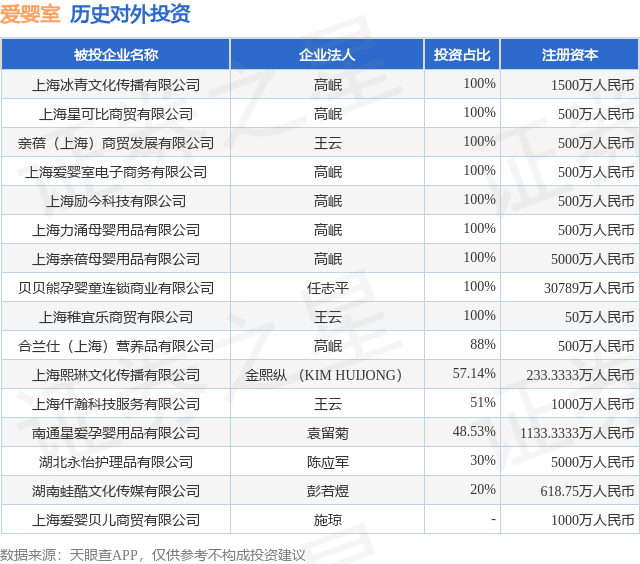 证券之星消息,根据天眼查APP显示,爱婴室(603214.SH)新增一起对外投资事件,被投资公司为上海爱婴贝儿商贸有限公司,法定代表人施琼,投资占比为-。该公司从事批发业,注册资本为1000万人民币。目前,爱婴室共存在对外投资16项,详见下表: