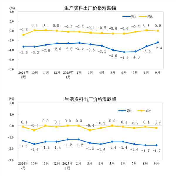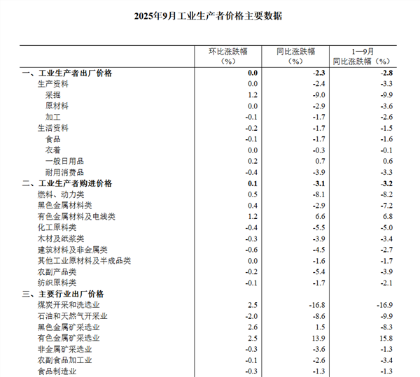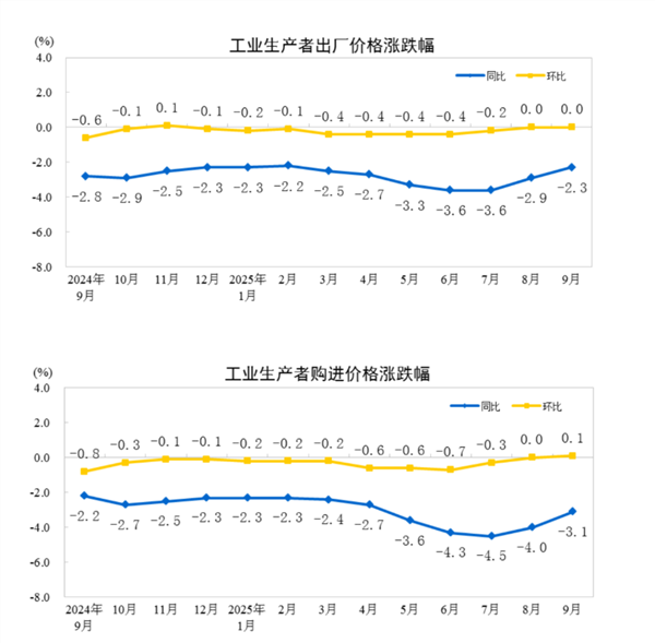 2025年9月份,全国工业生产者出厂价格同比下降2.3%,降幅比上月收窄0.6个百分点,环比继续持平。工业生产者购进价格同比下降3.1%,降幅比上月收窄0.9个百分点,环比上涨0.1%。1—9月平均,工业生产者出厂价格比上年同期下降2.8%,工业生产者购进价格下降3.2%。