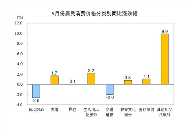 9月份,全国居民消费价格环比上涨0.1%。其中,城市持平,农村上涨0.2%;食品价格上涨0.7%,非食品价格下降0.1%;消费品价格上涨0.3%,服务价格下降0.3%。