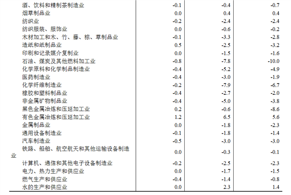 工业生产者购进价格中,燃料动力类价格下降8.1%,化工原料类价格下降5.5%,农副产品类价格下降5.4%,建筑材料及非金属类价格下降4.5%,黑色金属材料类价格下降2.9%,纺织原料类价格下降1.7%;有色金属材料及电线类价格上涨6.6%。