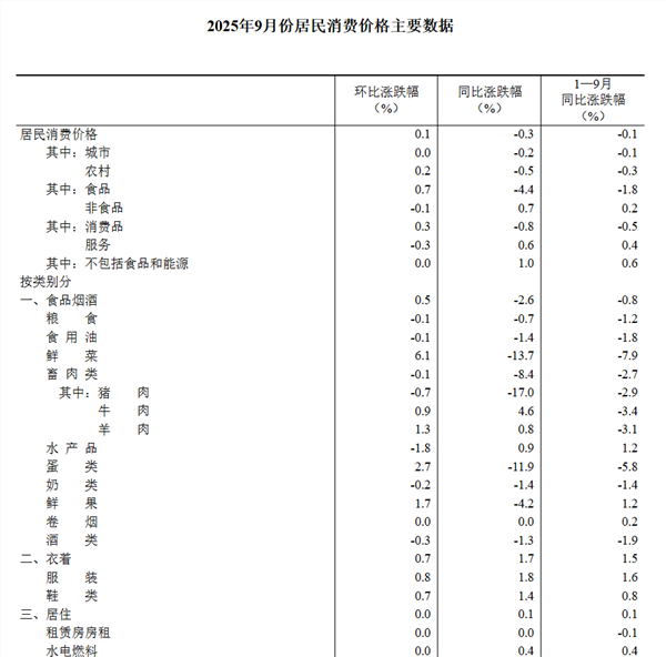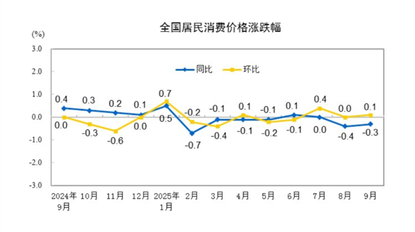 2025年9月份,全国居民消费价格同比下降0.3%。其中,城市下降0.2%,农村下降0.5%;食品价格下降4.4%,非食品价格上涨0.7%;消费品价格下降0.8%,服务价格上涨0.6%。1—9月平均,全国居民消费价格比上年同期下降0.1%。