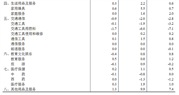其他七大类价格环比四涨一平两降。其中,其他用品及服务、衣着价格分别上涨1.3%和0.7%,生活用品及服务、医疗保健价格分别上涨0.3%和0.2%;居住价格持平;交通通信、教育文化娱乐价格分别下降0.9%和0.4%。