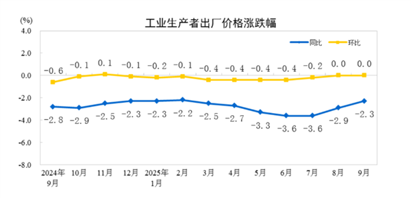 9月PPI环比连续两个月持平,PPI同比下降2.3%,降幅比上月收窄0.6个百分点