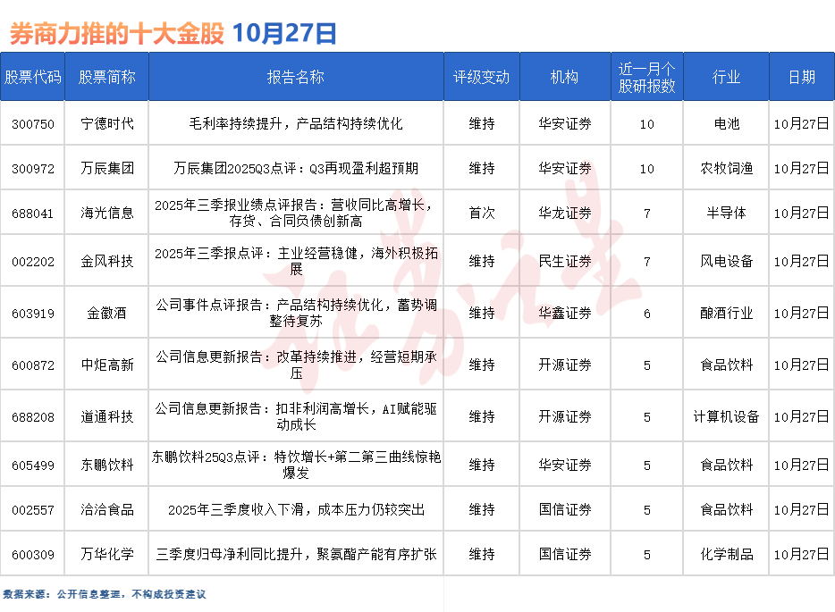 宁德时代最受券商关注,近一个月获西南证券、中银证券、民生证券、中邮证券、中国银河、国信证券、东莞证券等10份券商研报关注,位居10月27日券商力推股榜首。