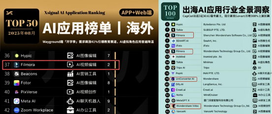 值得注意的是,视频创意软件明星产品Wondershare Filmora APP端及WEB端双端在“2025年8月海外AI应用总榜TOP50”中位列AI视频编辑类别TOP2,展现不俗实力;此外,Wondershare Filmora、Wondershare SelfyzAI、Wondershare Virbo、Wondershare UniConverter等产品还上榜“2025年8月出海AI应用总榜TOP100”。