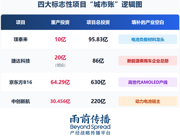 璞泰来补上游材料,捷达补下游总部,京东方补高端产线,中创新航补产业链主。
