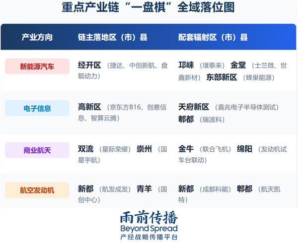 链主落地,配套随行。新能源汽车的链主在经开区,璞泰来的负极与隔膜材料、上海派电的两轮车落在了邛崃;士兰微的功率模块、世鑫新材的碳陶材料落在了金堂;蜂巢能源落在了东部新区。