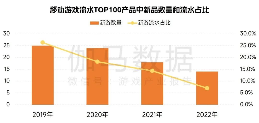 根据伽马数据监测,2022年有14款新游戏进入流水TOP100移动游戏名单,其流水占TOP100产品总流水的比例为7.0%,创下最近4年新低。自2019年以来,中国移动游戏流水TOP100产品中当年新品的数量持续下降,新品在TOP100产品中的流水占比也快速降低。