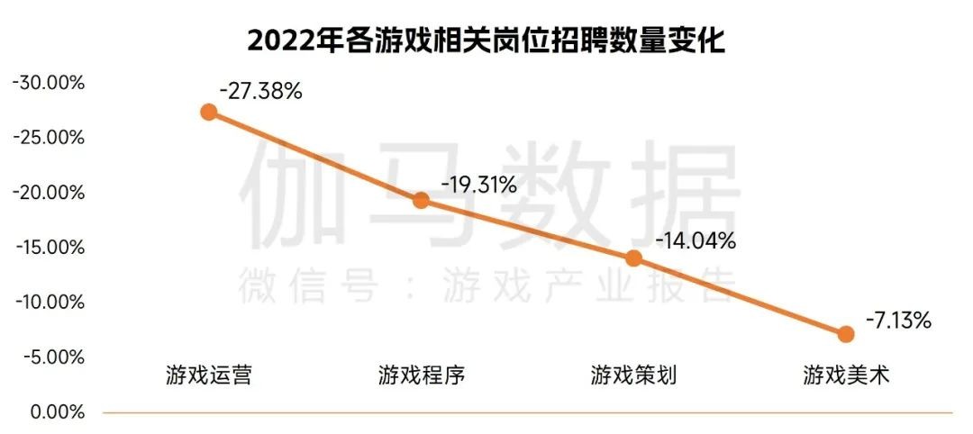 2022年游戏人才招聘需求下降,其中游戏运营岗位需求同比减少27.38%