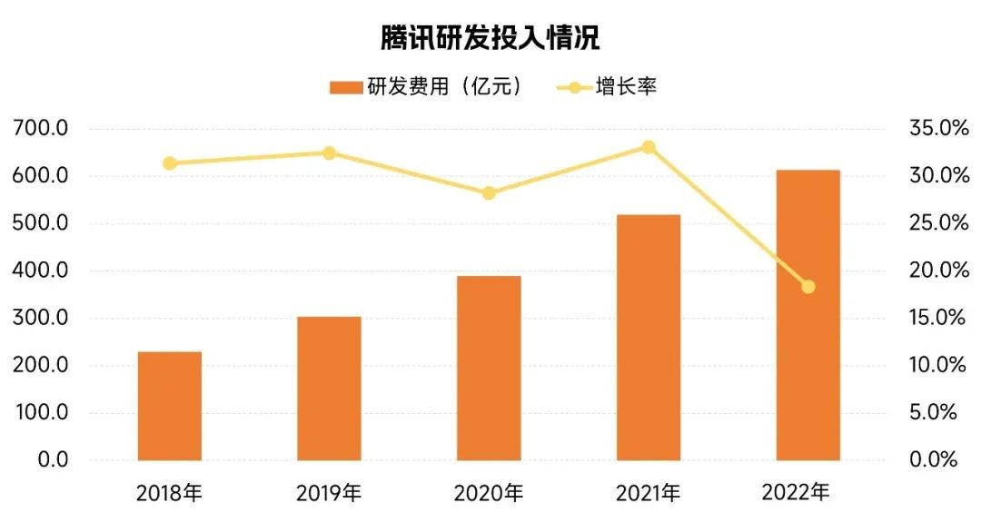 根据伽马数据的估算,2022年腾讯研发投入可能超过600亿元,同比增长超过15%。腾讯在研发投入基数较大的情况下,仍一直保持研发投入的高速增长,2018—2021年研发投入年增长率均在25%以上。