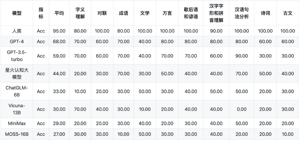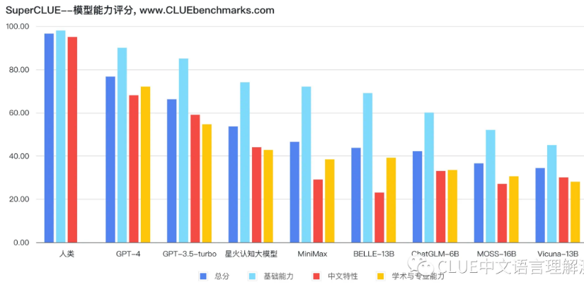 该机构利用 SuperCLUE 测试基准,对市面上主流的支持中文的通用大模型进行了评测与排名。从排名中我们可以看出,GPT-4 一骑绝尘,已经非常接近人类的能力。国产大模型中讯飞科技研发的星火认知大模型总排名第三,国内排名第一。